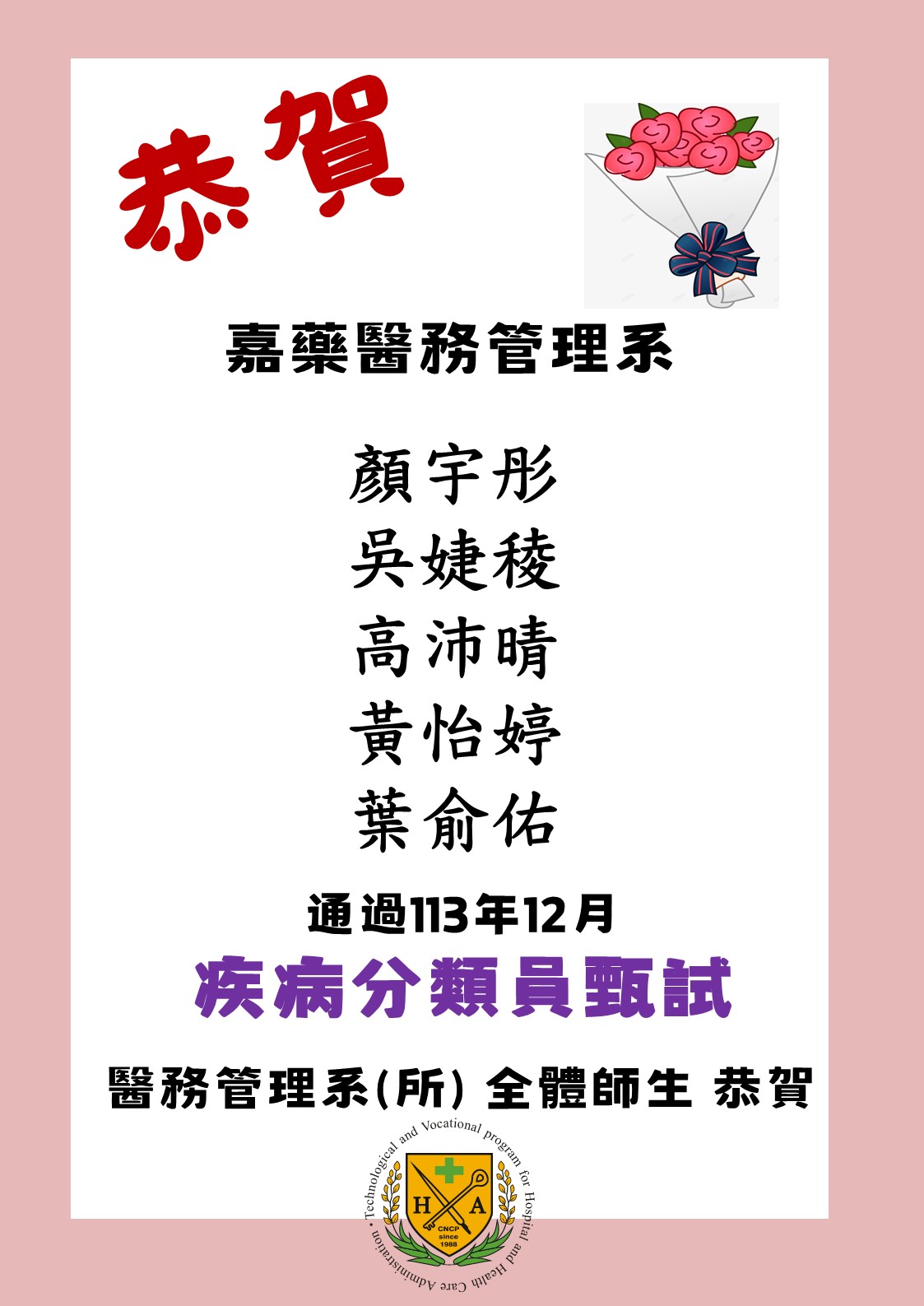 恭賀本系5名同學通過疾病分類員甄選