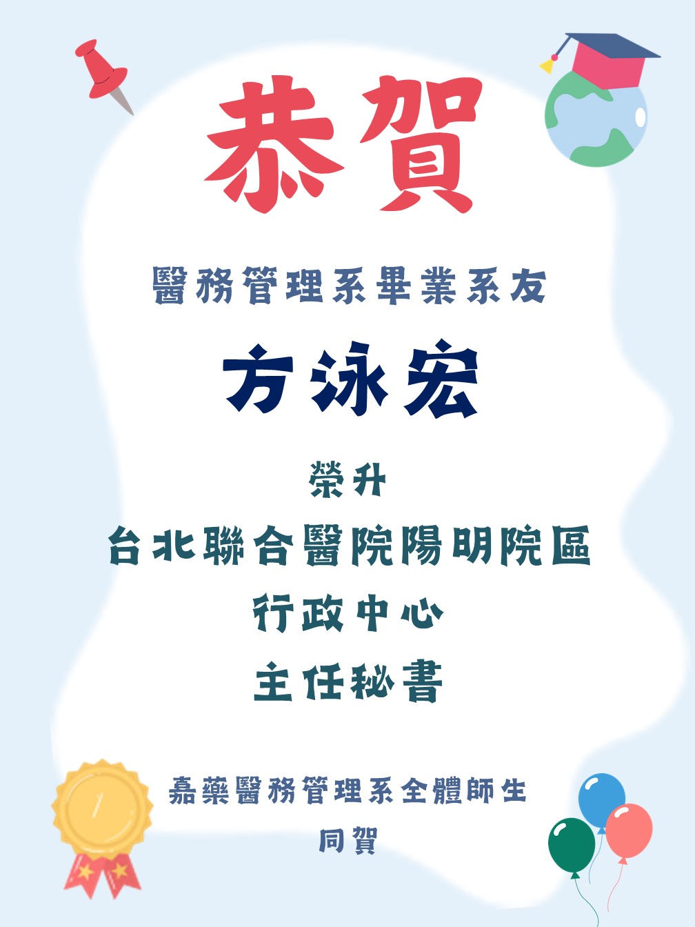 恭賀本系校友方泳宏榮升臺北聯合醫院陽明院區行政中心主任秘書